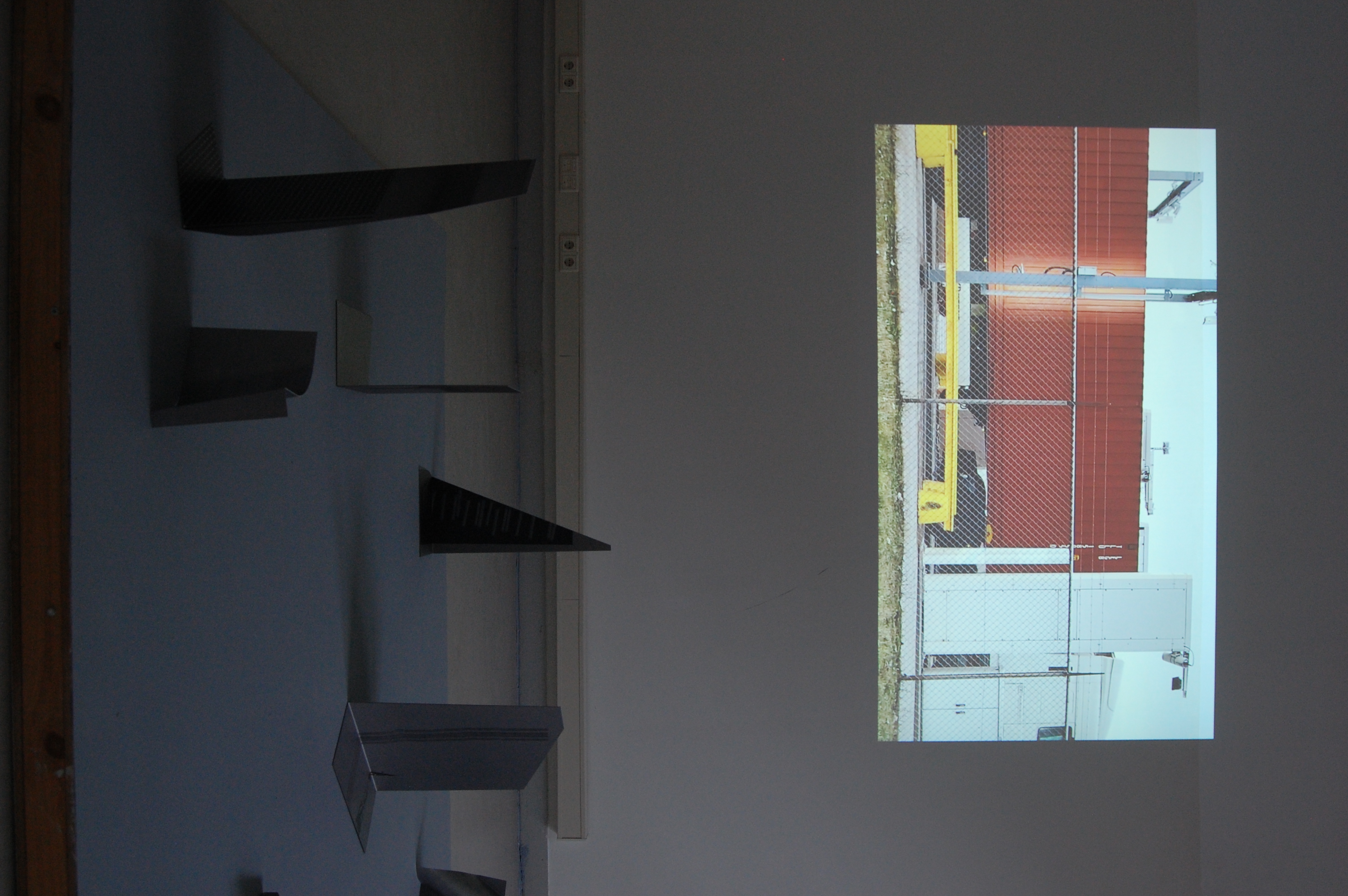 GET WORKED HARD consisted of a 9 minute film projected on loop, a 3 minute looped sound piece played through speakers, and a set of folded and rolled steel sculptures with images digitally printed on them.  The work stemmed from my time spent at the Port of Rotterdam, learning about the transit points and the truck drivers who act as mediators within the global transit of commodities. The port is a space of exchange and transaction, it’s synchronised choreography fuels the commercial world. This work draws a focus on the individuals who work in essential services that are often invisible to us: the truck drivers are significant because they embody a fragment of this infrastructural machine.  The film features shots of snaking chains of trucks carrying containers, across vast networks of roads. The footage is almost entirely devoid of the body, but one shot of a winking truck driver. The sound piece consisted of field recordings of the port and it’s machinery alongside a reciting of Google reviews of port transit companies written by truck drivers. Digitially printed and folded steel sculptures display collages of physical infrastructures around Rotterdam and it’s port.